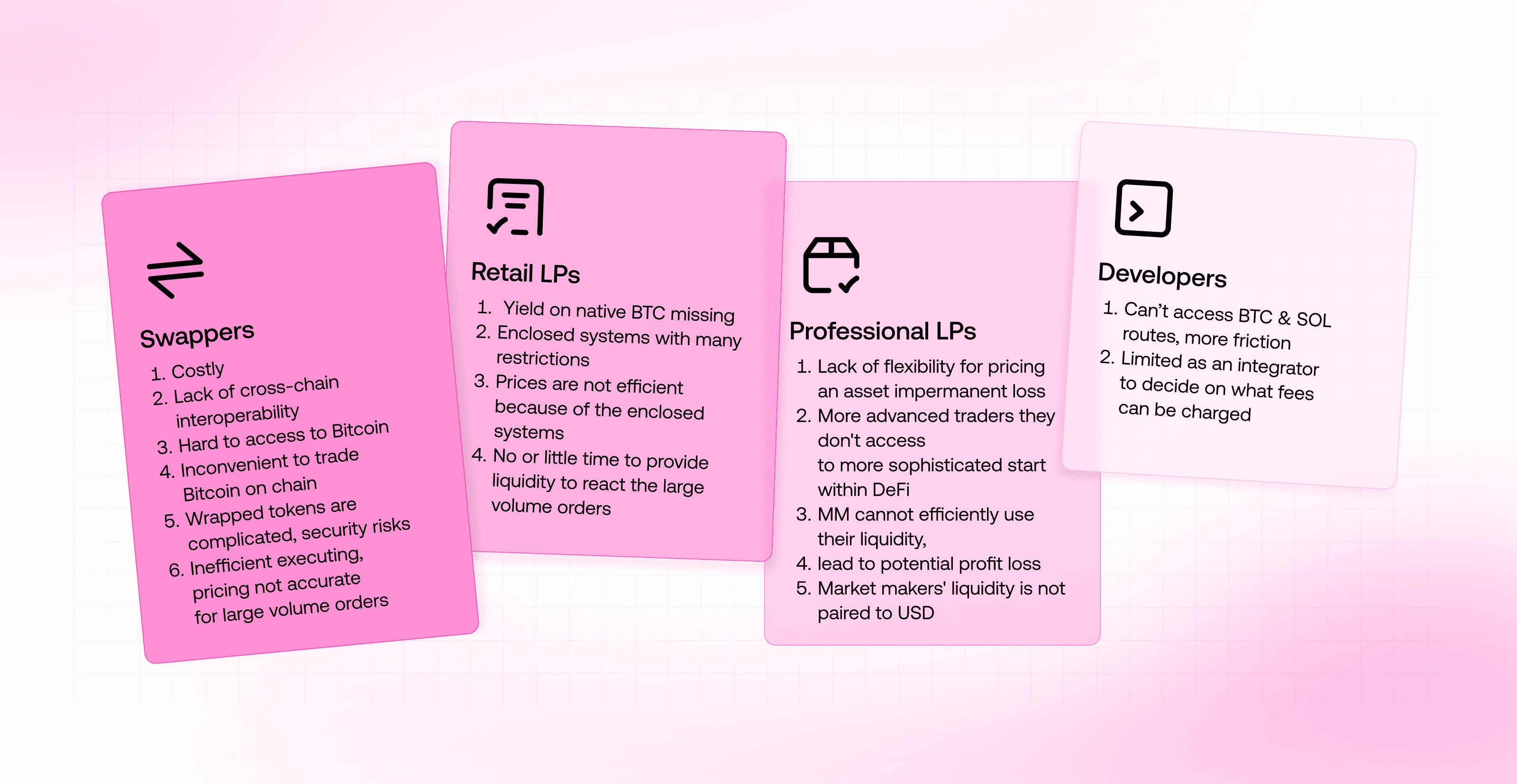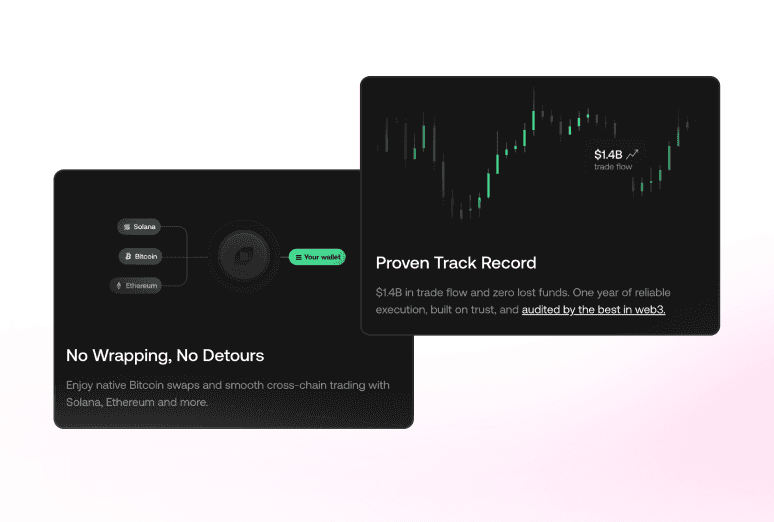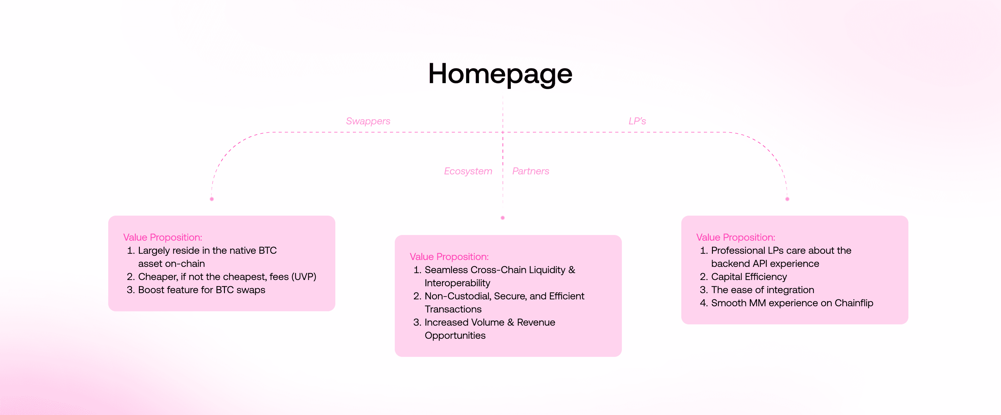 Dedicated pages for both swappers and LPs, ensuring each audience understands the benefits of the Swapping App and Liquidity Provision App. These pages explicitly showcase features like native BTC swaps, low fees,