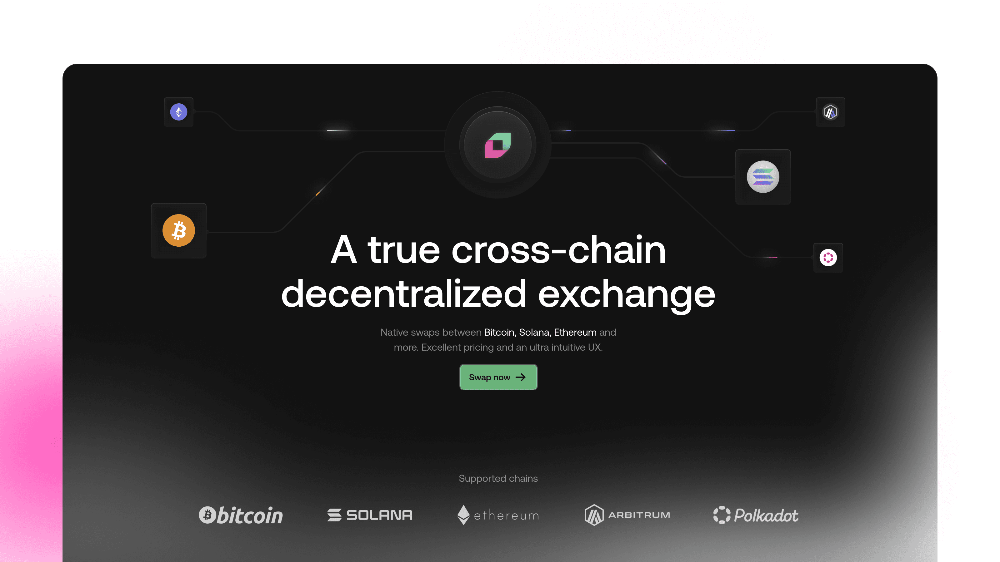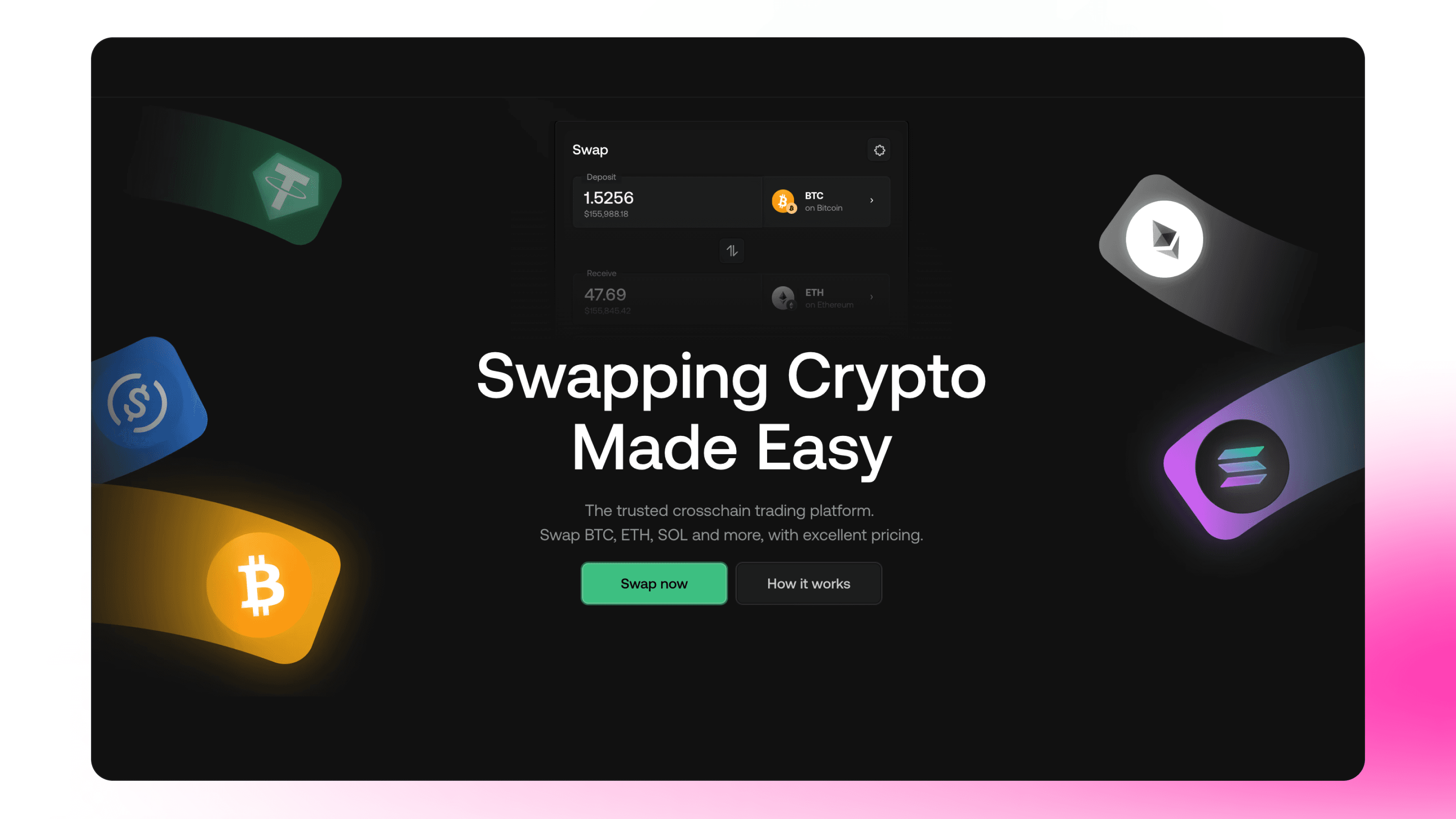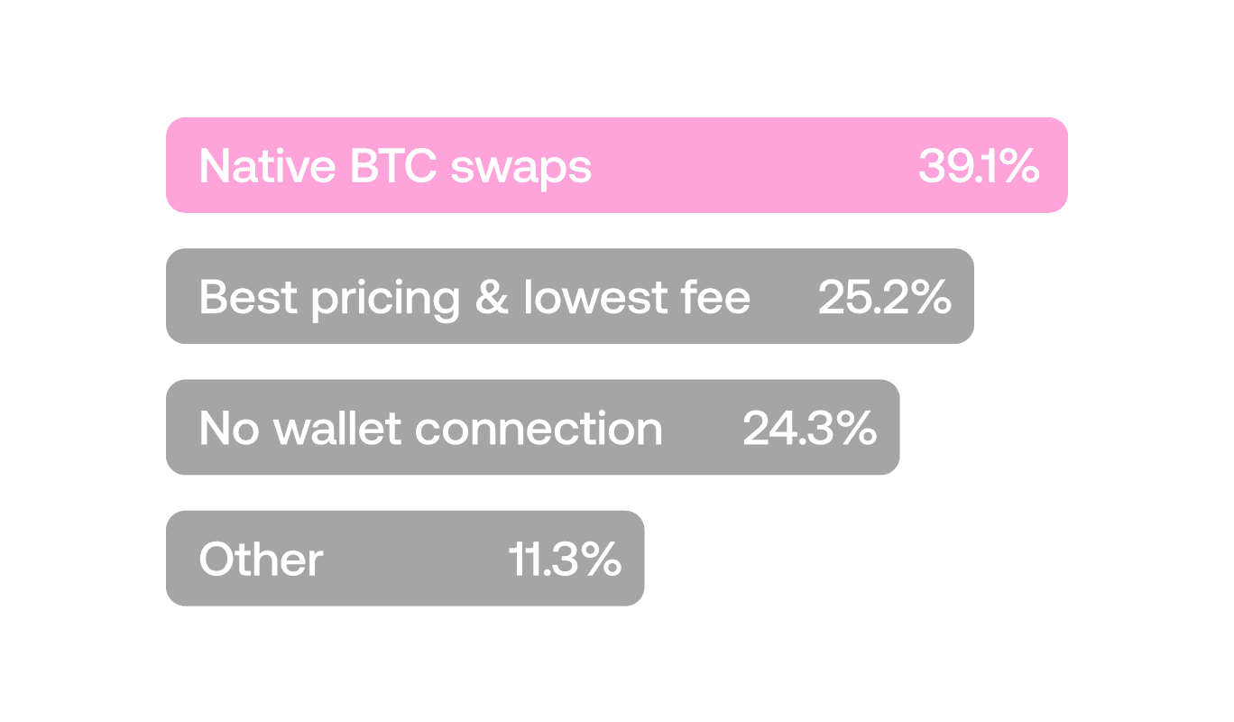 Ensure key product benefits are communicated through concise, benefit-driven copy supported by strong visuals, animations, or interactive elements that demonstrate features like native BTC swaps and low fees in action.